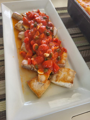 MAHI MAHI, CHERRY TOMATOES, GARLIC AND CAPERS